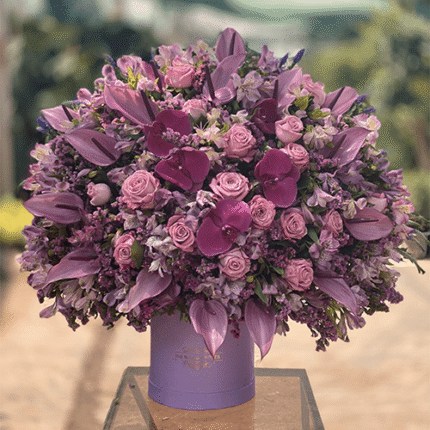 رزهای هلندی با رنگهای مخملی، آلسترهای لطیف، رزهای مینیاتوری با بافت ظریف و ارکیدههای سفید و صورتی، همگی در کنار هم ترکیبی متوازن و حرفهای را شکل دادهاند. باکس این مدل نیز با ظاهر مدرن، انتخابی مناسب برای فضاهای رسمی و لوکس است.
