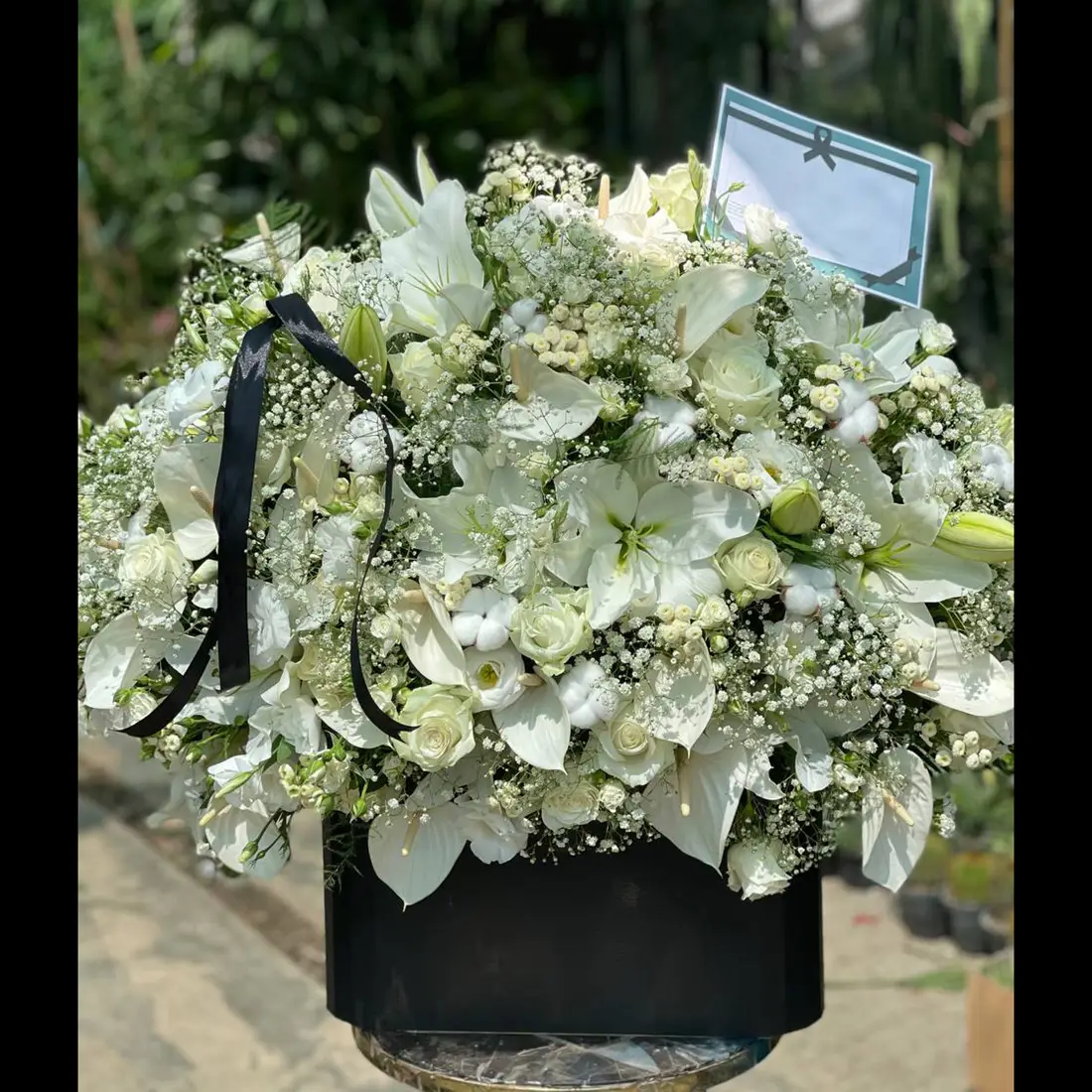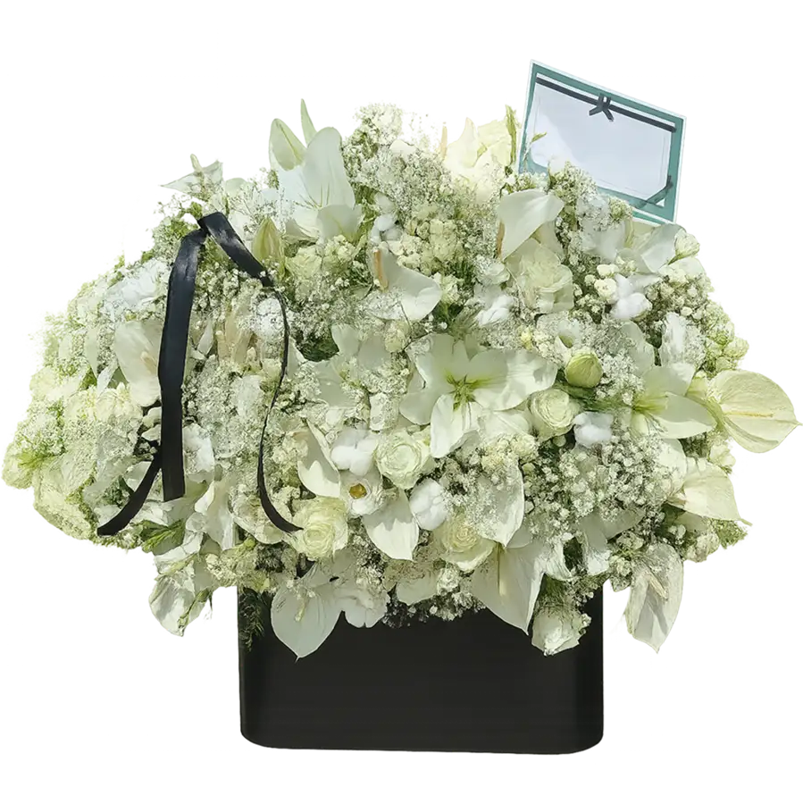 باکس گل ترحیم با طراحی ایستاده و فرم متراکم، شامل ترکیبی از گل‌های سفید لیلیوم، رز هلندی، آنتوریوم و ژیپسوفیلا، چیده‌شده در پایه مشکی با روبان تسلیت و کارت تسلیت. این مدل با رنگ‌بندی آرام و فرم رسمی، انتخابی شایسته برای مراسم ختم، یادبود، تسلیت شرکتی یا ابراز همدردی شخصی است.