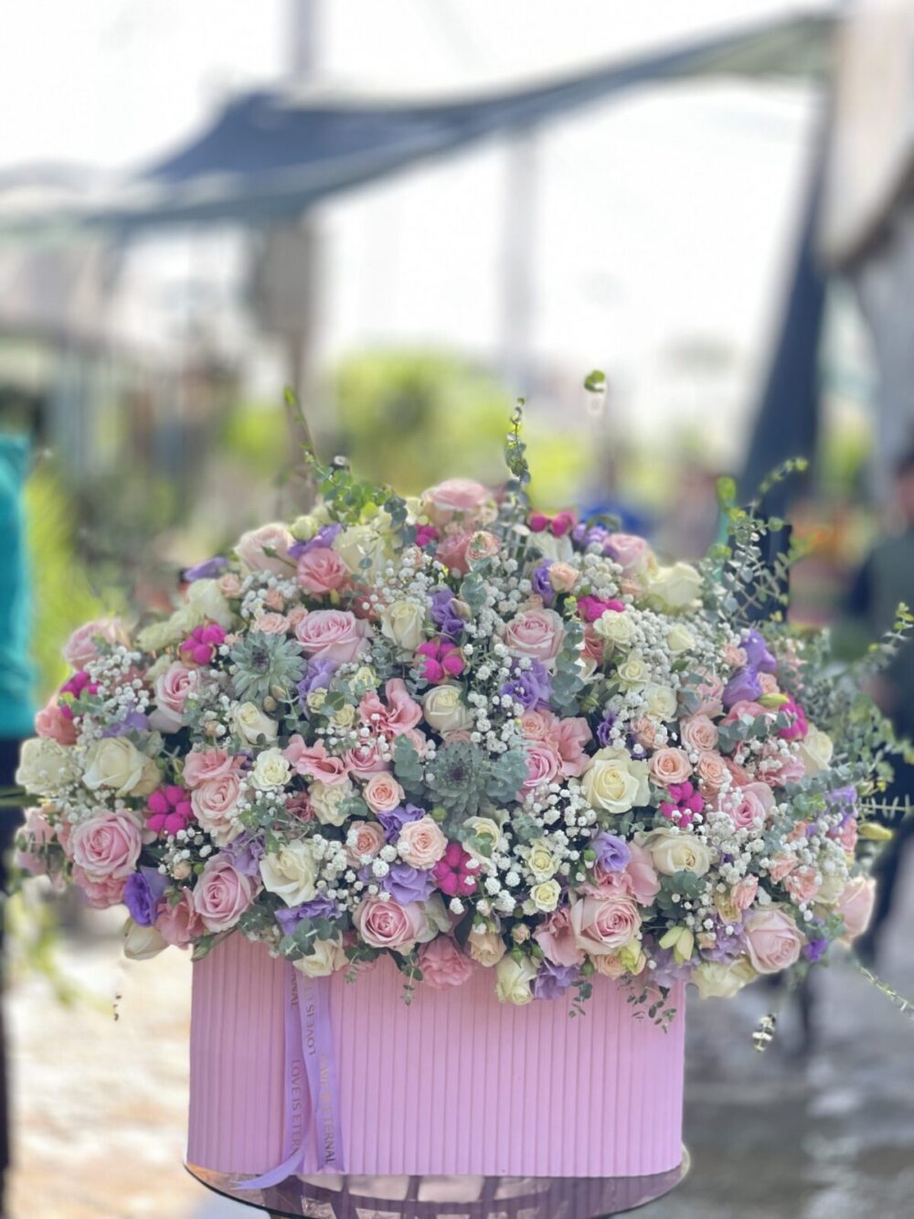 خرید در واتساپباکس گل لاکچری سایز بزرگ، گزینهای زیبا و خاص برای جشنها، خواستگاریها و مناسبتهای شادی است. این باکس گل به ابعاد حدودی عرض 90 سانت و ارتفاع 70 سانت، طراحی شده است تا زیبایی و شکوه مراسم شما را دوچندان کند
