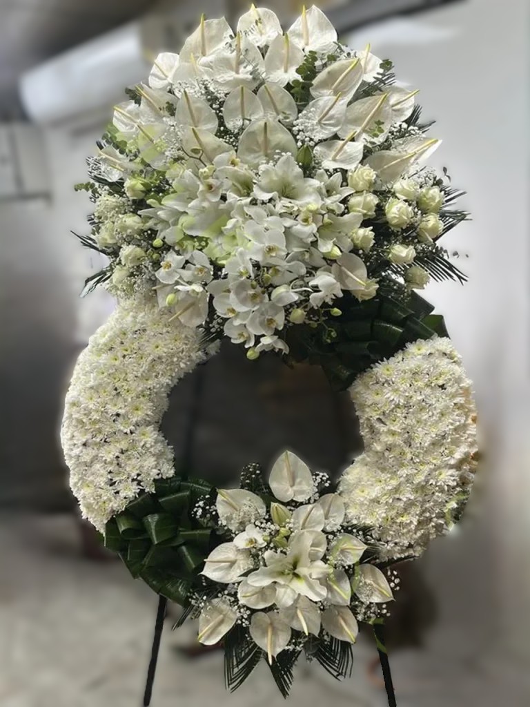 خرید در واتساپتاج گل درباری ۳ طبقه، با ترکیبی از گلهای داوودی، آنتریوم، رز هلندی، ارکیده، عروس، لیلیوم اورینتال و اکالیپتوس، مناسب برای مجالس ترحیم با طراحی باشکوه و اجرای حرفهای