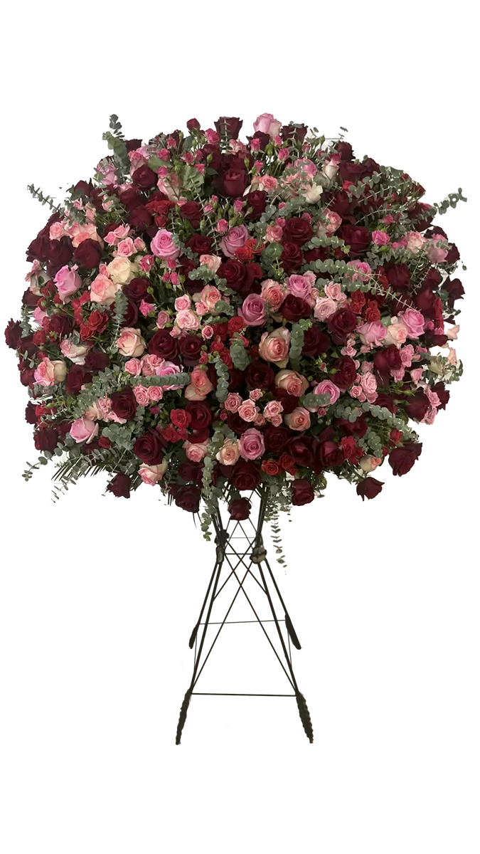 توپ گل رز تمامرخ با ارتفاع ۱۸۰ سانتیمتر، طراحیشده با ترکیبی باشکوه و متراکم از ۲۰۰ شاخه رز هلندی، ۳۰ دسته رز هلندی و برگهای اوکالیپتوس نقرهای. این طراحی بهصورت گرد و تمامرخ اجرا شده و قابلیت نصب روی جام پایهدار یا پایه فرفورژه را دارد.