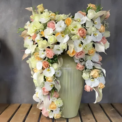 جام گل تسلیت مدل سناتور با ارتفاع ۱۱۰۰ سانتیمتر، طراحیشده با ترکیبی متوازن و باشکوه از ۲۰ شاخه گل اصلی، ۱۰ دسته داوودی و ۳ دسته آلستر. این ترکیب با رنگبندی ملایم و چینش حرفهای، جلوهای آرامشبخش و محترمانه برای مراسمهای ختم، بزرگداشت و ابراز همدردی ایجاد میکند.