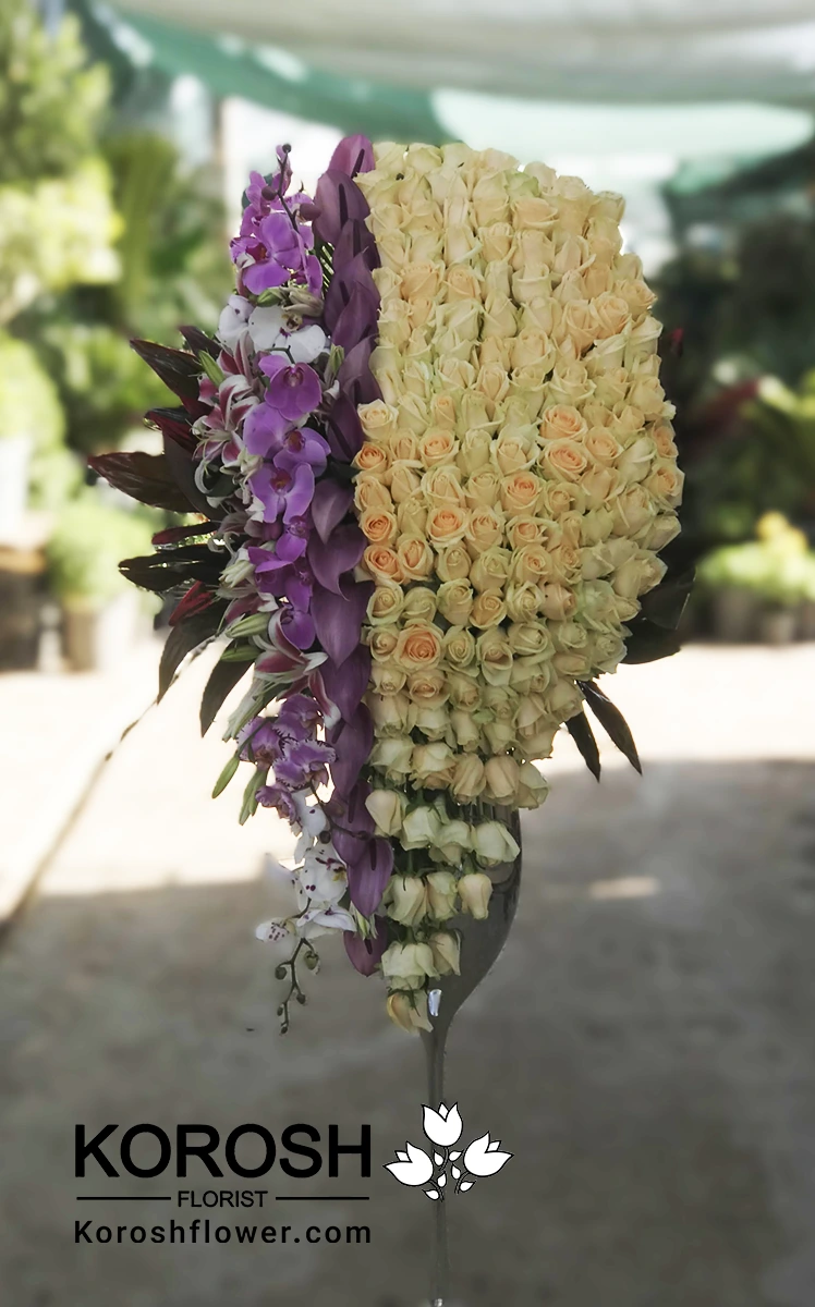 - ترکیب گلها: ۲۰۰ شاخه رز نباتی، آنتوریوم بنفش، ارکیده، اوریانتال