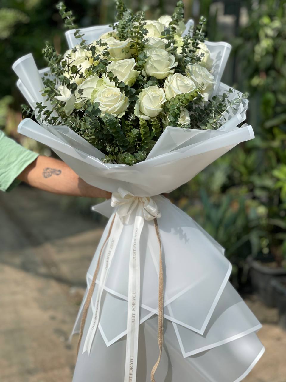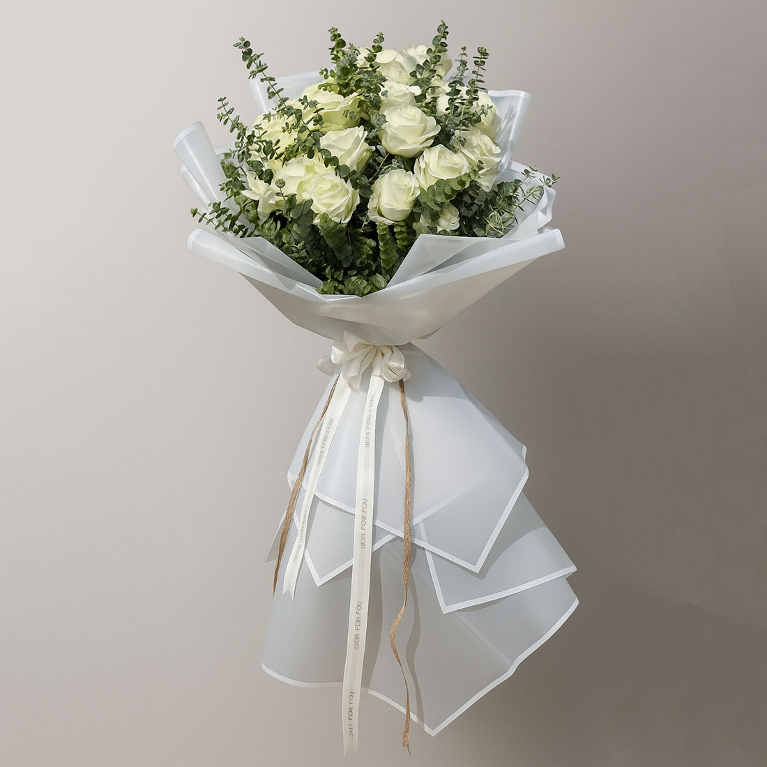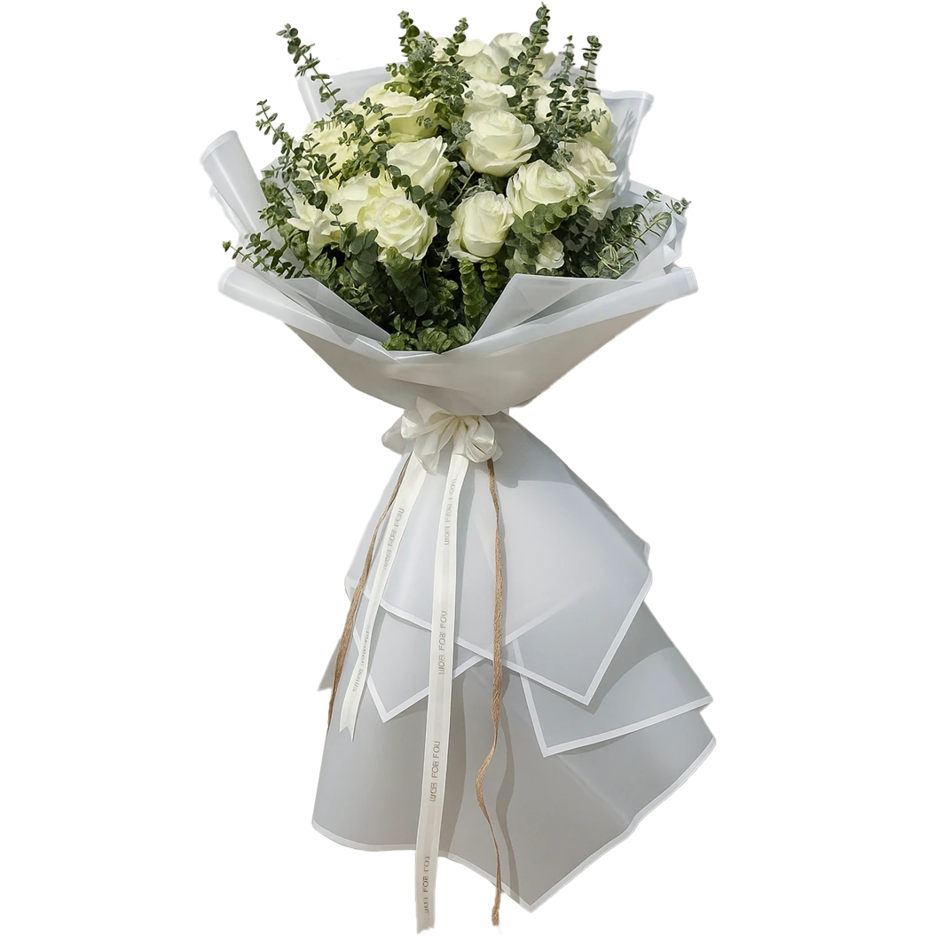 رزهای سفید با گلبرگهای ضخیم و فرم کلاسیک، در کنار برگهای اوکالیپتوس با بافت لطیف و رنگ ، ترکیبی متعادل و طبیعی را شکل دادهاند. بستهبندی شفاف و سفید، حس تمیزی و لطافت را تقویت کرده و روبان جلوهای رسمیتر به آن بخشیده است.