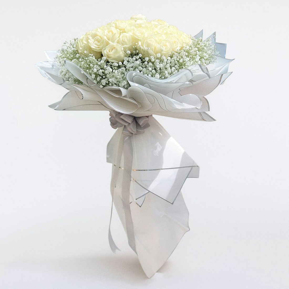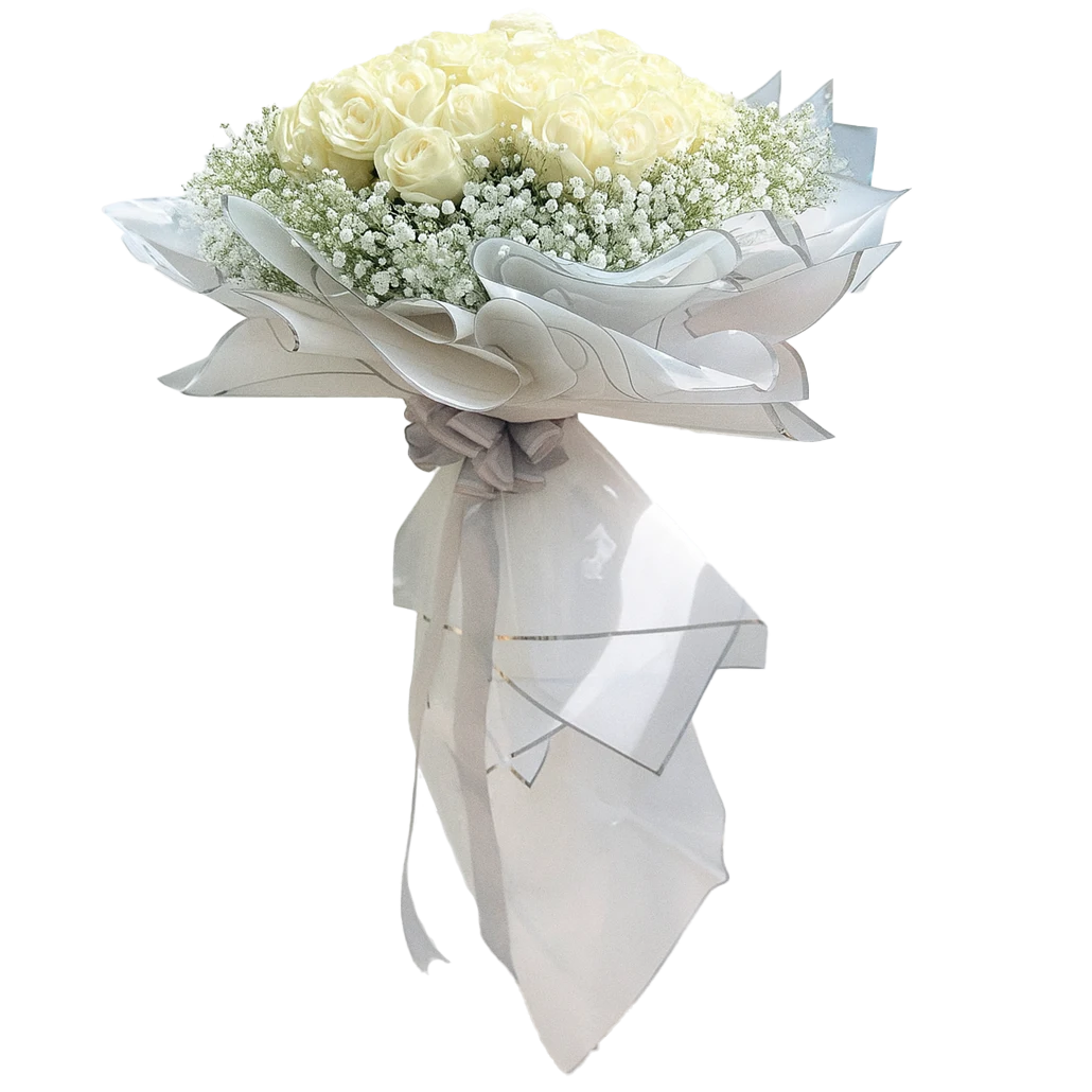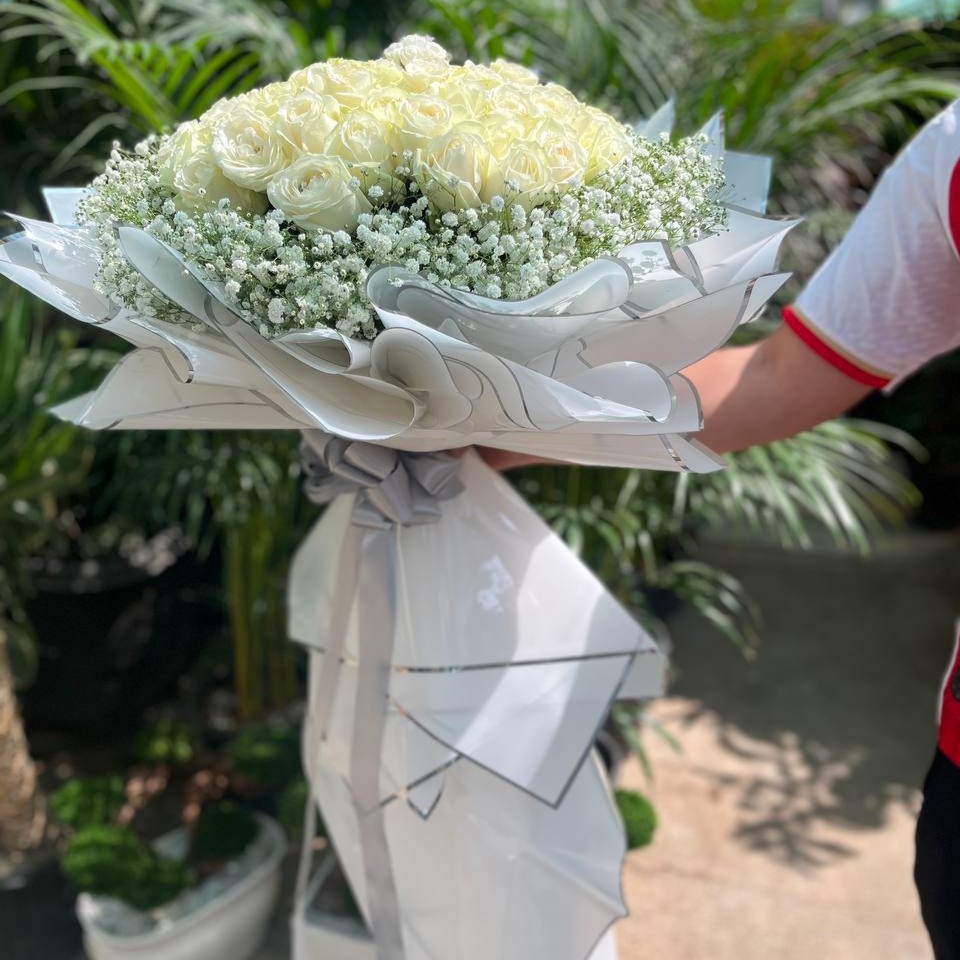 - ترکیب گلها: ۶۰ شاخه رز هلندی سفید، ژیپسوفیلا سفید